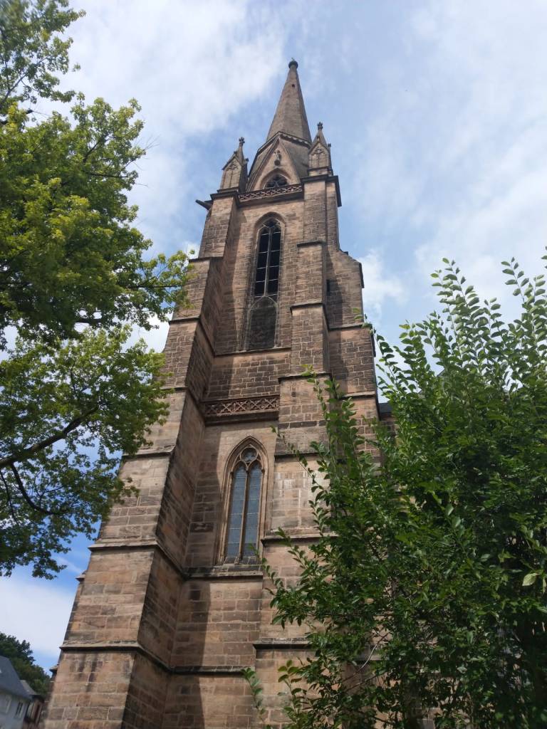 Wenn man vom Marburger Hauptbahnhof aus startet, sind es nur wenige hundert Meter zur Elisabethkirche. Die Errichtung der Kirche begann im Jahre 1235. Geweiht wurde sie 1283. Sie ist die älteste rein gotische Kirche in Deutschland. Die Elisabethkirche wurde vom Deutschritterorden unter Förderung der Landgrafen von Thüringen zu Ehren der heiligen Elisabeth von Thüringen erbaut. Die Kirche wurde zu Ehren Elisabeths errichtet, weil sie 1228 ein Hospital in Marburg gründete, in dem sie bis 1231 Kranke pflegte. Ihre Gebeine befinden sich in einem Schrein der Elisabethkirche.
